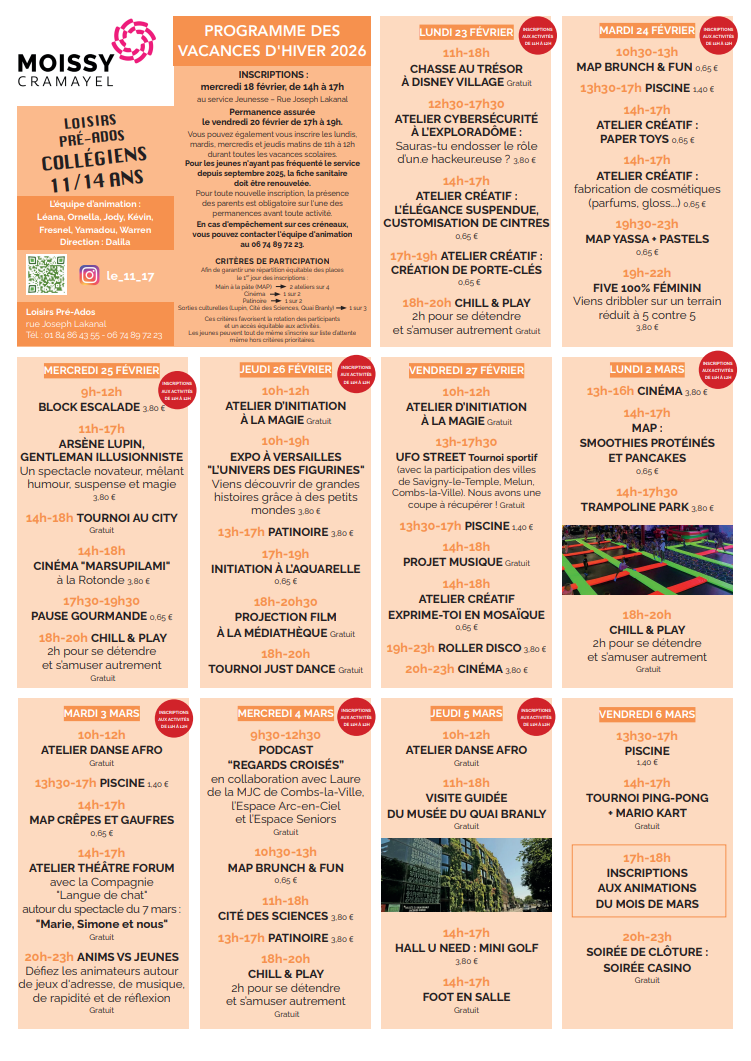 - Du lundi 2 au vendredi 6 mars : stage pour les 6-12 ans … Combs la ville.
